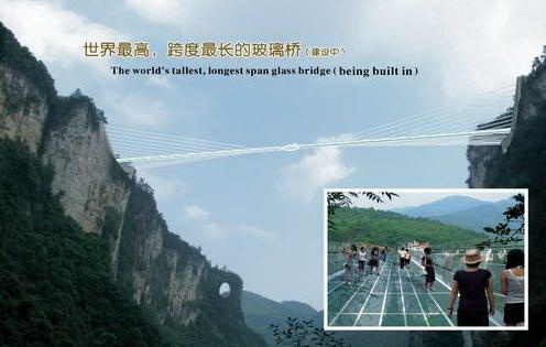 - 5月1日,具有世界最高蹦极的世界最高、最长的玻璃桥——张家界大峡谷玻璃桥的两座副桥正式向游人开放,邀游客前往测试胆量。这座玻璃桥位于张家界大峡谷景区,是世界最高、跨度最长的玻璃桥,大桥建在大峡谷两侧的峰顶上,横跨大峡谷桥拱距谷底相对高度约400米,全长约370米,桥面全部采用透明玻璃铺设,桥中心有全球最高的蹦极。站在桥上,脚下400米处的谷底全景尽收眼底。玻璃主桥建成后将申报吉尼斯世界纪录。