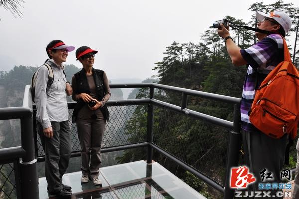 游人在玻璃观景台留影观景