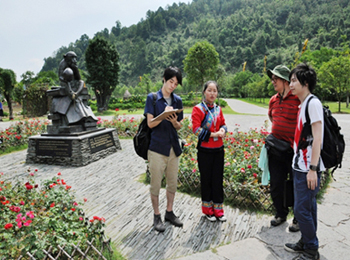 在黄龙洞景区,绪方俊雄教授一行先后参观了洞内的自然遗产和洞外的生态广场。洞内巧夺天工的自然景观让他感到惊讶,洞外天人合一的生态景观让他身心陶醉。尤其是景区的生态建设,让这位致力于生物学和生态学研究的日本教授格外关注,一边仔细听着景区导游员的耐心讲解,一边向翻译询问着自己关心的问题。当他得知黄龙洞田园牧歌景点是中国风景区首例征用农田仍保留原状的景区时,不由自主地伸出大拇指进行赞赏。