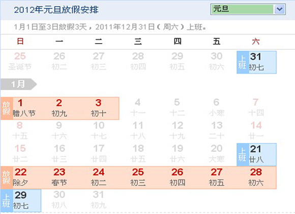 一、元旦:2012年1月1日至3日放假调休,共3天。2011年12月31日(星期六)上班。