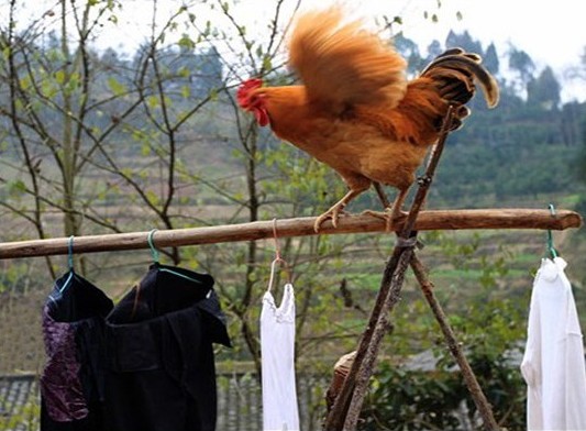 (张家界桑植县,一只勇敢的大公鸡跳上了主人晒衣服的晾衣杆,想像着自己是一名体操健将,一步一步,认真地玩起了体操项目平衡木,勤劳的农民在繁忙或闲暇之时若看到这一幕想必会很快忘掉一天的劳累,大公鸡可要小心了,如果弄坏了主人的衣服就……)