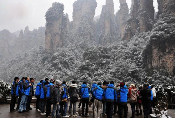 首页 旅游社区 旅游新闻 张家界武陵源 新年新气象 新雪俏装游客爱