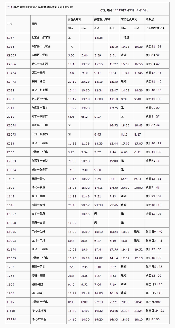春运期间(1月8日-2月16日),张家界车务段管内张家界、吉首、石门县站,开行怀化至上海南L315/6次,开行怀化至广州K9184次,具体开行日期以车站公告为准。