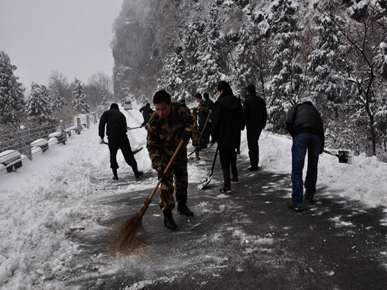 张家界市武陵源区各部门工作人员清扫积雪保持道路通畅
