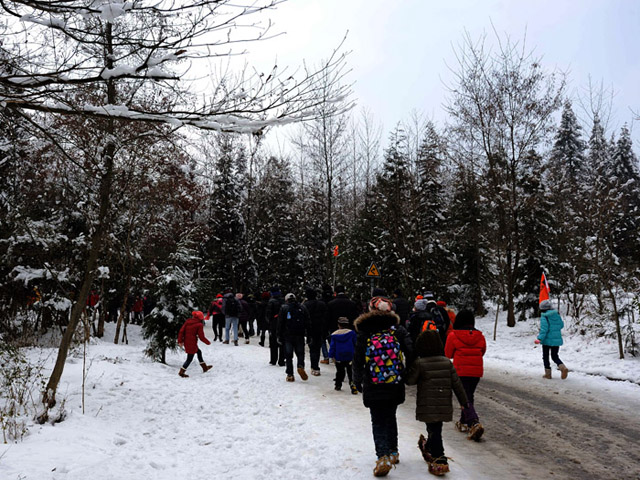 漫步在雪地里的游客继续他们快乐的旅程