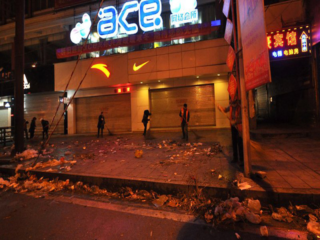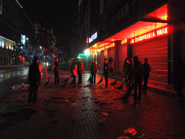 张家界城区的一角,晚上还有环保工作人员在清扫节日后留下的垃圾