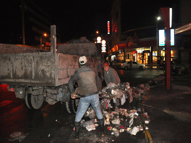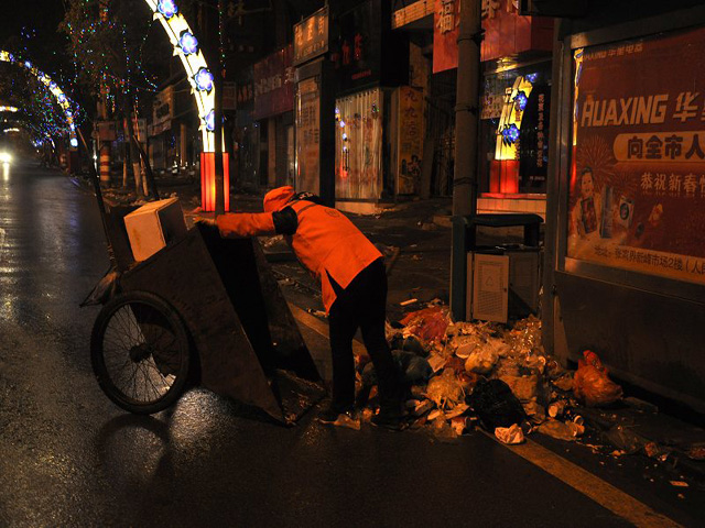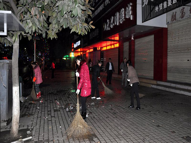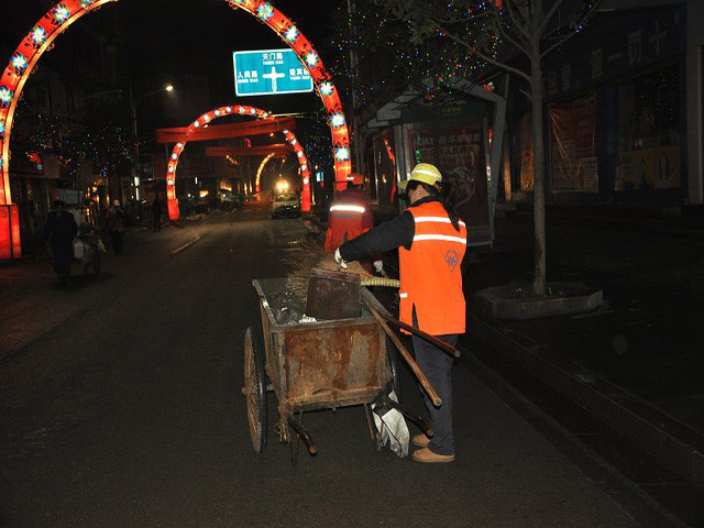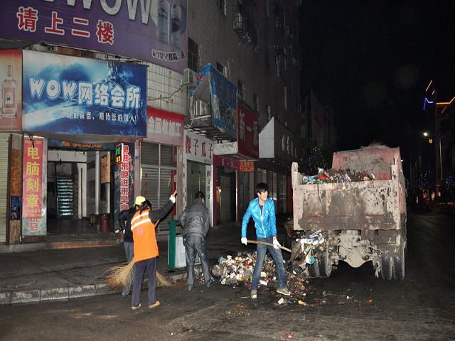 晚上的街道,没有来去匆匆的行人,只有环保工作人员忙碌的身影