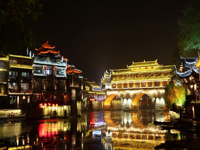 夜晚灯火辉煌的凤凰古镇,有人称她繁华如秦淮河,璀璨浪漫如秦淮河。的确,这个到处矗立着灵动飞舞之姿的徽派建筑的古镇,与如长城般防护墙的建筑设施相结合,那厚重坚固的城墙与灵动飞舞的房屋构成凤凰古镇有别秦淮河的内在风貌。作为历史军事重镇,其防护墙有南长城之称。也深蕴着苗族被征服的苦难历史及徽商机动灵活的求生存发展的智慧。