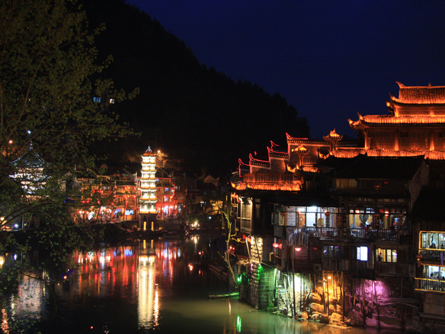 21日,应吴导游的要求,六点我们就起床了。具体行程我已经不太记得清楚了,午饭后开始往凤凰古城进发,途中经过吉首城,路过了某歌星的家乡,了解到了湖南偏僻山区的景象。在凤凰吃过晚餐后参观古城夜景,灯光很美,水很清,水流也很轻,仿古的街道上人群川流不息,在后现代重音乐的包围下古城人声鼎沸,此时的凤凰古城焕发了第二春,它沉淀的不再是顽劣不化的古董,而是充斥了年轻的气息。
