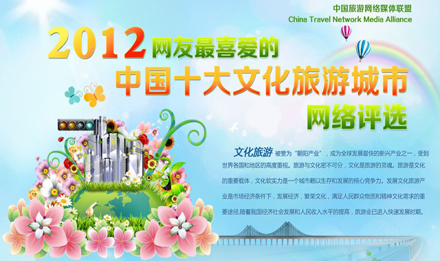 2012网友最喜爱的十大文化旅游城市评选活动,将本着公平、公正、公开的原则,挖掘有文化底蕴和旅游资源的城市,用网友的实际投票选择来给入选城市的旅游网络营销提供有价值的参考。