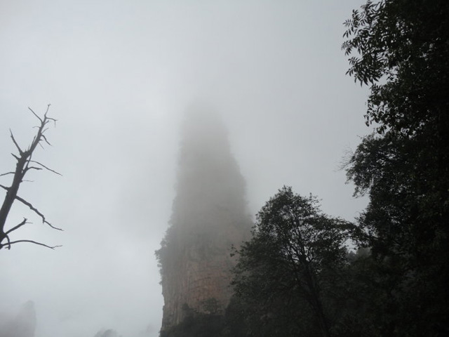 至天子阁,便觉豁然开朗,狭细的石阶山路,一步而变为宽阔的广场。数十米外的御笔峰,可谓西海的奇景之最,因其形似竖笔,位处天子山而得名。观御笔峰,浑然不敢相信此竟是山石所就,依我看来,便似一截立柴被竖劈成了四五片,柴木力劈之下,已然弯拱扭曲,却能互相依扶而不倒,若抽取其中任何一片,必是烟消云散了。
