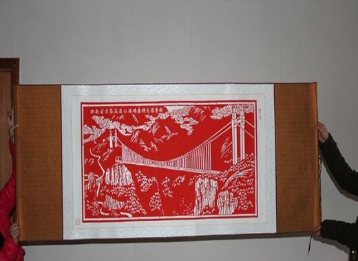 历经近5年的艰辛施工建设,矮寨特大悬索桥即将竣工通车。为见证和展示我州高速公路建设史上这一惊世奇葩,泸溪县沅水旅游文化传播有限公司,通过挖掘和创新国家非物质文化遗产——踏虎凿花传统技艺,前后历时近一年,设计创作完成了《矮寨特大悬索桥》这一民族民间艺术珍品。
