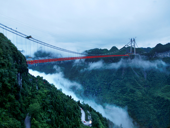 奇桥——矮寨大桥独创四个世界第一,桥面距离峡谷底部高度达355米,大桥主跨1176米,跨高330米,为方便观赏峡谷风光,设计了两条观光通道;