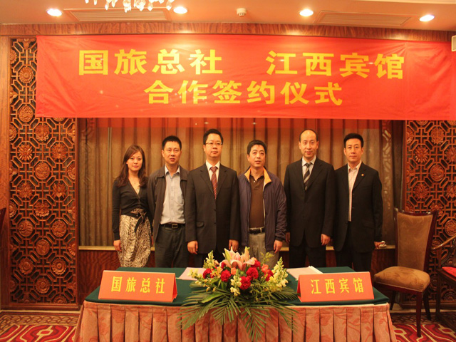 2011年4月15日,在第18届中国国内旅游交易会期间,我社和江西宾馆在西安市唐乐宫就增资扩股江西省中国国际旅行社有限公司一事签署了合作协议。国旅总社副总裁陈月亮、总裁助理陈路、国内旅游部总经理张陵捷以及投管部相关人员,江西宾馆董事长黄健、江西国旅副总经理王伟峰及相关随从人员共同出席了签约仪式。