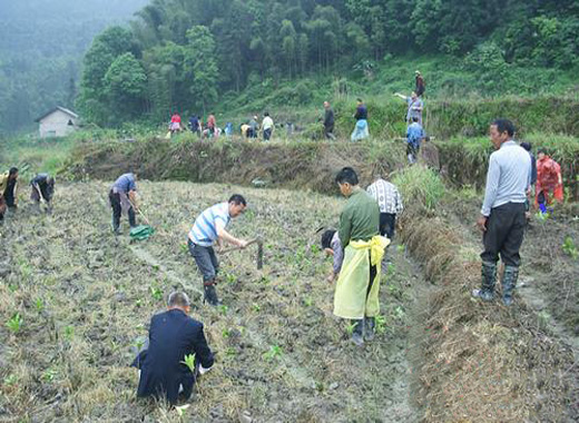 5月9日,张家界武陵源区协合乡龙尾巴村民居委会组织150名农民冒着大雨栽种了近百亩土地,5万株桂花树苗。