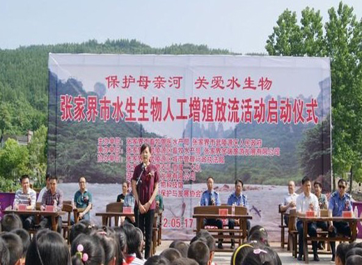 5月17日15时18分,张家界市水生生物人工增殖放流活动启动仪式在武陵源索溪河畔举行。随着国家农业部渔政指挥中心副主任肖放女士宣布张家界市水生生物人工增殖放流活动开始,10万尾大鲵、鲤鱼和鲫鱼鱼苗缓缓游入美丽的索溪河,回归大自然,融入张家界秀美的山水之间,用实际行动谱写“保护母亲河•关爱水生物”的赞歌。