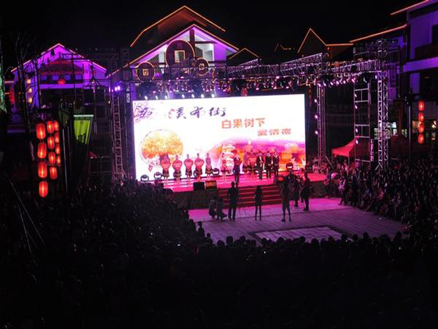当晚,张家界溪布街彩灯妖冶,人流如织,不同肤色,不同服饰的男女老少,游客商贾,俪伉情侣,云集在溪布街,尽情享受“白果树下爱情夜”。他们或乘坐彩船,在索溪河荡漾一腔幽情;或呼朋引伴,在主会场表演抢亲闹剧;或登临闺楼,窥觅着精致漂亮的绣球;更有楞头小伙,干脆拥挤在各十字街口,等待那将创世界纪录少女们的世纪相拥……溪布街,正描绘着休闲、激情、浪漫、唯美的幅幅画面。