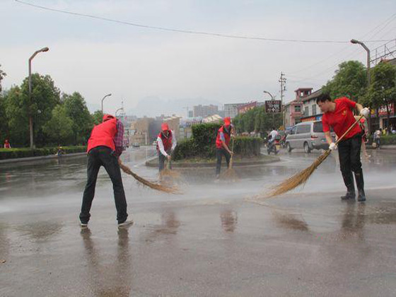 为迎接第七届中国中部投资贸易博览会暨5·19中国旅游日活动在张家界市举办,深入开展“喜迎中博会•社区志愿服务周”主题活动,大力弘扬志愿者精神,普及志愿服务理念,5月16日上午,市直机关100余名党员志愿者在市委副书记、市委秘书长、市直机关工委书记范运田的带领下来到张清公路、大庸西路、子午西路等城市道路上,利用扫帚、洒水车等对路面进行彻底“洗脸”,被洗刷过的街道焕然一新。