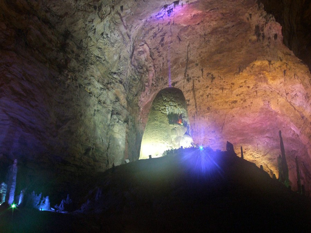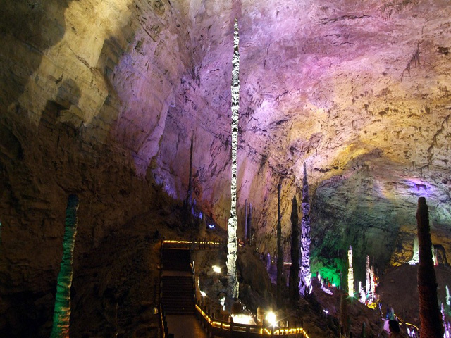 “定海神针”的上端离洞顶还有6米,顶部还有滴水,这说明它还在生长发育当中,估计再过6万年它就可以“顶天立地”了。作为洞中标志性景点,当然就得重点保护咯。在1998年,保险公司为其买下了一个亿的保险,创下了世界为资源性资产买保险之先河。正所谓“自然遗产无价宝,定海神针一亿保。”