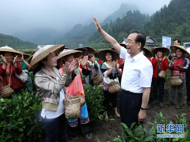 5月25日至27日,中共中央政治局常委、国务院总理温家宝来到湖南省湘西土家族苗族自治州古丈县、吉首市、花垣县就推进连片特困地区扶贫开发工作进行调研。这是5月25日,温家宝走进古丈县双溪乡梳头溪村茶田,向采茶妇女招手致意并询问种茶收入等情况。