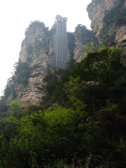 雨终于停了下来,水绕四门的侧面山顶便是号称张家界最精华的袁家界,大名鼎鼎的哈利路亚山原型---乾坤柱也就在袁家界,从水绕四门上到袁家界有两条路,第一条就是乘坐耗资人民币1.8亿元,被誉为“世界上最高、运行速度最快、载重量最大的电梯”的百龙天梯,百龙天梯气势恢宏,垂直高差335米,运行高度326米,每台次载客50人次,运行速度3米/秒,三台同时运行每小时往返量达4000人次,这么牛副的电梯当然票价也不便宜,56元每人。而第二条路便是由号称乱窜坡的乱窜坡爬山而上,此地听说脚程快的话1个半小时即可搞定。因为好奇心作怪所以毫不犹豫地选择了乘坐百龙天梯。