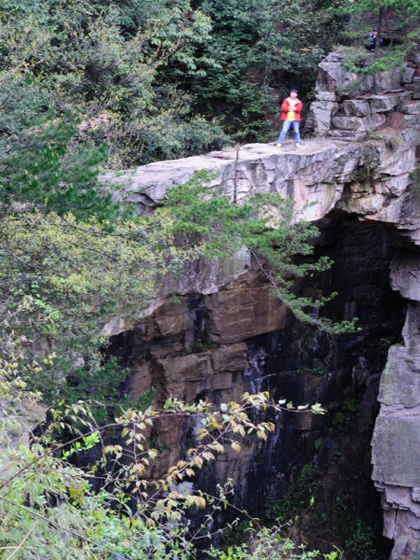 大观台景区共有天子座,仙人桥,一步难行等几个精华景点,在我看来,这大观台景区是绝不能错过的,由于从停车处到景区要下行半个小时左右,老婆带着豌豆和林二少奶奶就在路边休息吃东西,我、老妈、导游轻装上阵向景区出发。