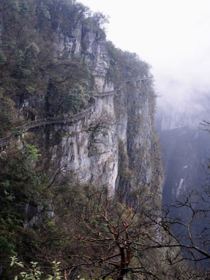 此时云开雾散,站在栈道上俯瞰群山,古人“会当凌绝顶,一览众山小”的感觉油然而生。由于天门山是国家森林公园,植被特别丰富,加上典型的喀斯特地貌,所以,在这条栈道上更能找到一种在乘坐直升飞机飞越大峡谷的感觉。由于海拔和气流的影响,很多小鸟都不能到达与栈道平行位置。所以,站在这里,脚下是没有边际的绿野,成群的小鸟在峡谷中嬉戏,偶尔有老鹰从眼前掠过,宛若置身天上一般。若与黄山西海大峡谷的幽深清远比较这里视野开阔倒是与站在长白山之巅有几分相像。
