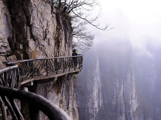 很快走完玻璃栈道,脱了鞋套,走上水泥铺成的鬼谷栈道,这鬼谷栈道起点是倚虹关,终点到小天门。因悬于鬼谷洞上侧的峭壁沿线而得名,相传鬼谷子在天门山绝壁上的鬼谷洞内隐居,研习易经,并传授当地百姓强身健体的鬼谷神功,也就是现在名闻天下的大庸硬气功。