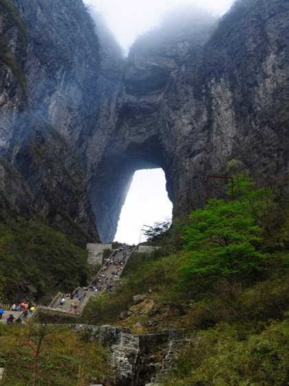 走走歇歇,终于爬到了顶端,向下一望,好一段长梯,我是怎么爬上来的呢?抬头一看,好一个天成大洞啊、南北对穿,门高131.5米,宽57米,深60米,拔地依天,气场惊人啊,以前有六国特技飞行员曾驾驶飞机穿过天门洞,这段视频我看到过,确实叫人瞠目结舌。