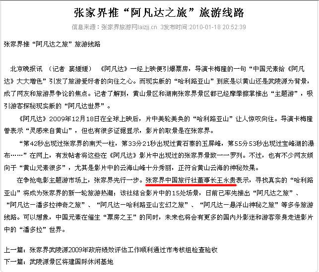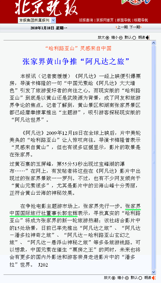 >>> 《北京晚报》对张家界中国国际旅行社推出“阿凡达”之旅所做的报道