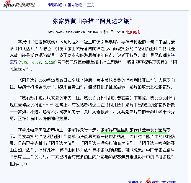 但记者今天发现张家界中旅抄袭《北京晚报》昨日关于“张家界国旅全国首家推出《阿凡达》之旅”的报道未注明出处,并对其中的内容进行篡改。
