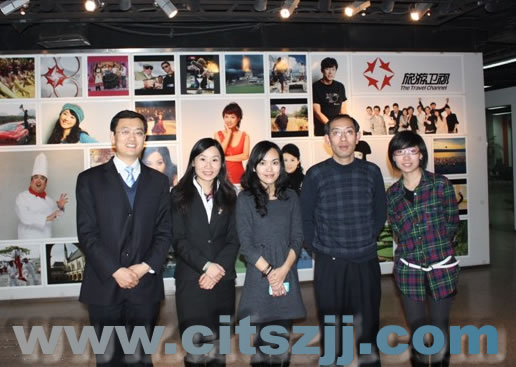 < align=center>张家界中国国际旅行社董事长郭宏辉(右二)与旅游卫视记者合影留念