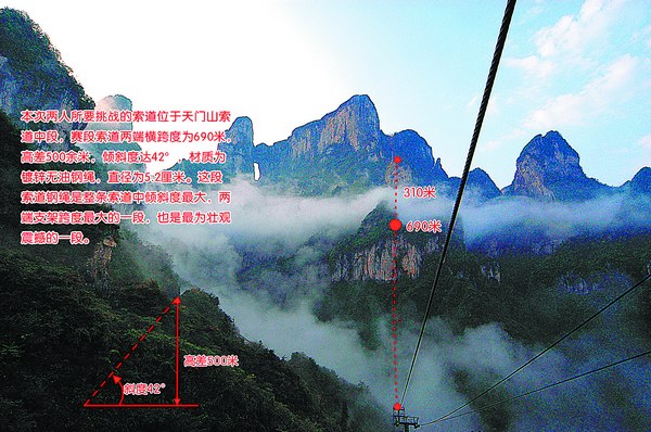 “此次两人联袂在世界最长最陡险的索道之一天门山高山观光索道的钢绳上进行巅峰对决,不仅将挑战自己的极限能力和全世界其他高手以前的一切难度纪录,还将证明谁才是世界高空走钢丝的至尊王者。”天门山景区相关负责人说。