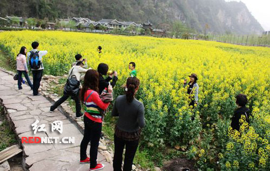 阳春三月,湖南省张家界武陵源黄龙洞景区金黄的菜花,粉红的桃花,雪白的李花竞相开放,春光明媚,景色宜人,吸引无数中外游人纷至沓来。