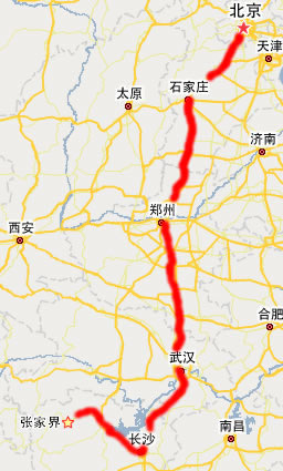 自驾车途经城市:北京—(经京珠高速)→ 长沙—(经长常高速)→ 常德—(经常张高速)→ 张家界市-→ 张家界国家森林公园(或武陵源风景区)