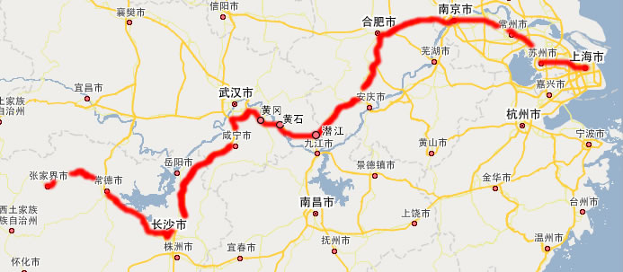 自驾车途经城市:上海—→南京—→合肥—→潜山—→黄冈—→黄石—→武汉—(经京珠高速)→长沙—(经长常高速)→ 常德—(经常张高速)→ 张家界市-→ 张家界国家森林公园(或武陵源风景区)(