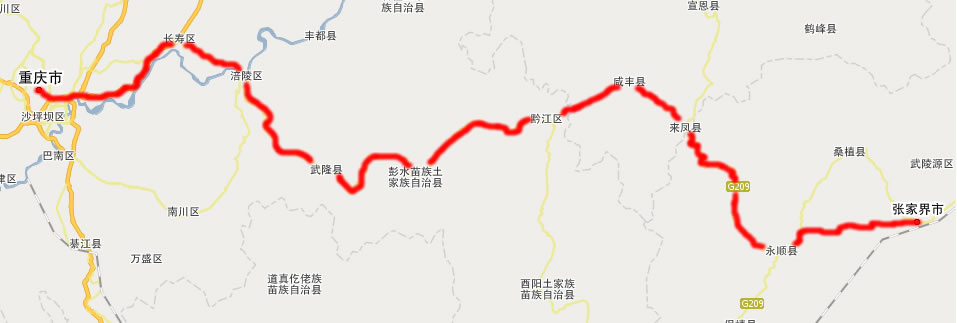 自驾车途经城市:重庆—→涪陵—→武隆—→彭水—→黔江—→咸丰—→湖南龙山—→永顺-→张家界市