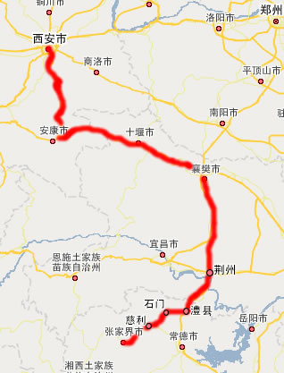 自驾车途经城市:西安—→定州—→襄樊—→荆州—→公安—→湖南澧县—→石门县—→慈利县-(过桥之后直接前行)→张家界市