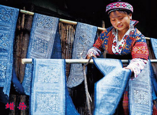 蜡染原始古朴,分为两大流派:一为土家族蜡染印花布:一为苗族蜡染土布。土家蜡染印花注重配色纯净,讲究立意构图,成形的布料呈花异彩流布,幅面艺术风格特异纯美,突出的工艺特点为热色:苗族蜡染土布注重染色纯,不讲究华美雕饰,给人一种自然纯净的艺术感,突出的工艺特点为冷色。