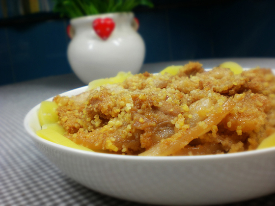 在农家,每当逢年过节,或者操办婚嫁喜事,都要备加一盘小米蒸肉,这是宴席中不可缺少的,制作时,一般选用较肥厚的细嫩猪肉,拌合浸泡好的小米,加上可口的作料,放在锅里蒸煮,待小米和肉熟透后即可。小米蒸肉极富营养价值,鲜美可口,是五竿儿女最喜吃食的一种佳菜名品。