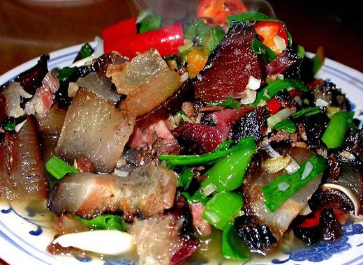 熏腊肉是一般农家喜吃的一种菜食,在凤凰的土乡苗寨有一种隔年熏腊肉的习惯,腊肉确实是一种少有的民间佳肴。在凤凰的土寨苗乡,流行着一句民间谚语:“腊月到了头,家家熏腊肉,四月阳春正当忙,隔年腊肉喷喷香。”。