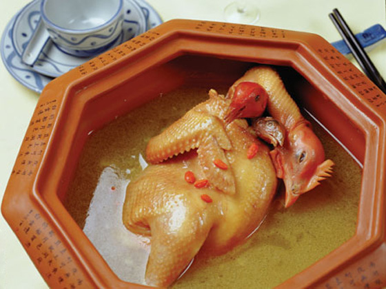 传统湘菜,为长 沙名厨柳三和擅长的名菜之一。20年代末,鲁涤平主湘,其侧室沙夫人患头痛,医者荐方以一麻雀、一斑鸠、一乌骨母鸡,用天麻套蒸饮汤治病。柳三和根据配方易以母鸡内放一鸽子,鸽子内放一麻雀,麻雀之内放天麻、枸杞之类,三物套蒸,制成三层套鸡而名噪一时,颇受上层人士赞赏。何键主湘时,经常在三和酒家宴客。