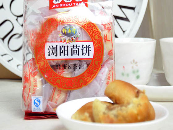 浏阳茴饼是浏阳著名的传统产品,已有300多年的历史。它采用糖皮包酥、缸隔炉烤的独特制作方法,以面粉、茶油、白糖、饴糖作主料,金桔花、小茵香、熟芝麻、桂子油、碎冰糖等为辅料,经过和皮子、和蕊子、擦油酥、扯脐包酥、开皮灌蕊、成型烘烤等十多道工序精制而成。
