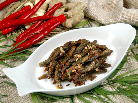 3.锅内留少许油,下蒜、葱末、干椒粉,放入炸酥的火焙鱼,烹入对好的调味汁,迅速翻炒,淋上香油、撒葱花即可。