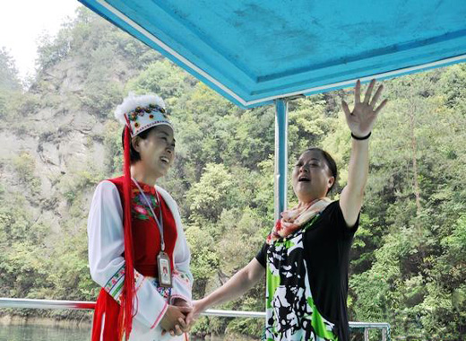 “马桑树儿搭灯台,写封的书信与耶郎带哟……”5月11日上午,张家界优秀导游熊金霞身着漂亮的白族服饰在武陵源宝峰湖景区做时义工时,以一首原汁原味的桑植民歌赢得了一批台湾游客的热烈掌声。 掌声过后,这批游客成员不停地与熊金霞合影留念,其中一名洪姓游客举起大拇指称赞:“这种形式我们很喜欢,既让我们听到了对宝峰湖景区的生动讲解,又让我们感受到了张家界悠久的民族文化,我们热爱张家界!” 张家界优秀导游员进景区做义工,由张家界市旅游协会导游分会组织发起。此前5月8日开始,曾在“黄石寨索道杯”第五届张家界导游风采大奖赛获奖的十大魅力导游李春霞、刘娜便开始在武陵源十里画廊景区、张家界魅力湘西大剧院,为到访游客热情免费进行景点讲解服务,并深受游客好评。 张家界市旅游协会导游分会秘书长刘云介绍,优秀导游进景区做义工是今年3月份开班的“张家界导游大讲堂”的重要内容之一,旨在通过名山名水与优秀导游的融合,全方位展示张家界导游员的良好形象,传播张家界悠久的民族历史文化,推进张家界精品导游队伍的建设,为提升张家界的知名度和美誉度贡献更大的力量。
