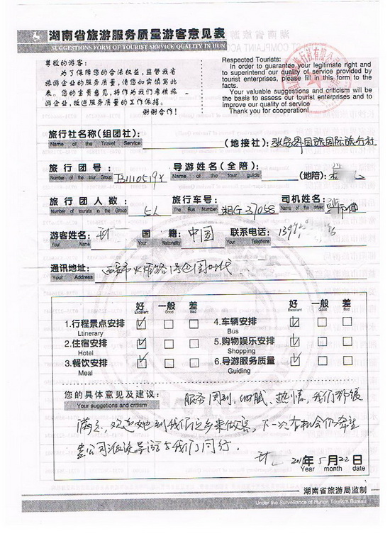 5月19日晚上接到客人,感觉客人都很好,对我也很亲切。遇到这么好的客人,我很高兴极了。 第二天,我们开始了在张家界的旅程,上午,我们去了黄石寨,客人们都被黄石寨的美景所吸引了。下午,我们游览了张家界最美的峡谷—金鞭溪。一天的行程下来,客人们都感觉非常的好,觉得张家界的山美水美,人更美。到晚餐的时候,我带客人去了缘中源,在那里,我给客人介绍了本地最有特色的土家菜。在之后的行程我们都相处得非常开心,客人对我的评价也很好。总的来说,这次的旅行还是非常愉快的。