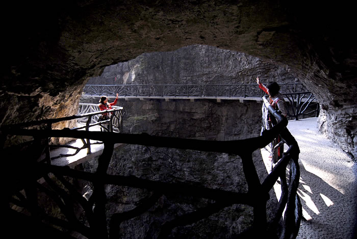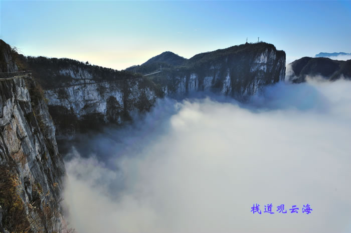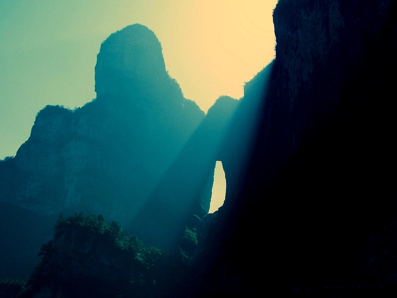 天门洞,高131.5米,宽50余米,南北对开于千寻素壁之上,气势磅礴,巍峨高绝,是罕见的高海拔穿山溶洞,更是尽显造化神奇的冠世奇观。天门洞终年氤氲蒸腾,景象变幻莫测,时有团团云雾自洞中吐纳翻涌,时有道道霞光透洞而出,瑰丽神奇,宛如幻境,似蕴藏天地无穷玄机。地方史志曾记载:“玄古之时,有土人见霞光自云梦出,紫气腾绕,盈于洞开,溢于天合,以为祥瑞,肃而伏地以拜之”。自古以来,奇幻美丽的“天门吐雾”、“天门灵光”,被认为是天界祥瑞之象,名闻遐迩。