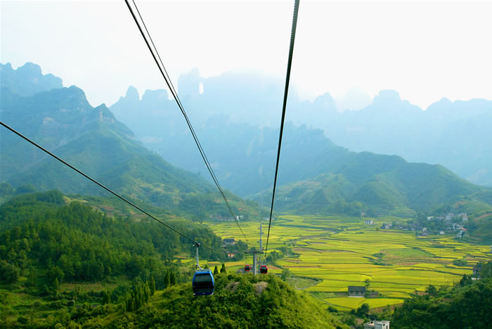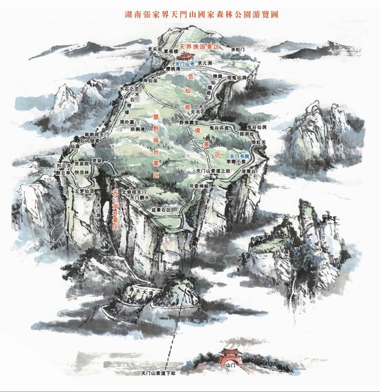 - 三国吴永安六年(公元263年) ,嵩梁山千米高绝之处峭壁忽然洞开,玄朗如门,吴帝孙休视之吉兆,天门洞开之说流传天下,嵩梁山也由此易名天门山。拔地擎天的天门山,山势陡险峻拔,景色雄奇壮丽,被称为张家界的天然画屏。天门山隆起开始于燕山运动,再经喜马拉雅山造山运动,山体剧烈抬升千米以上,周围被断层节理深深切割,加上长期风雨侵蚀的岩溶作用,造就成嵯峨高峙、凌空独尊的喀斯特台型地貌。其山顶相对平坦,保存着完整的原始次生林,有着很多极为珍贵和独特的植物品种,森林覆盖率达90%。其间古树参天,藤蔓缠绕,青苔遍布,石笋、石芽举步皆是,处处如天成的盆景,被人誉为世界最美的空中花园和天界仙境。