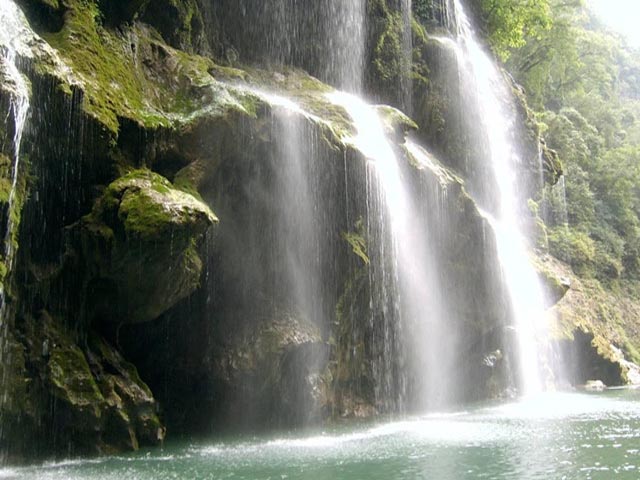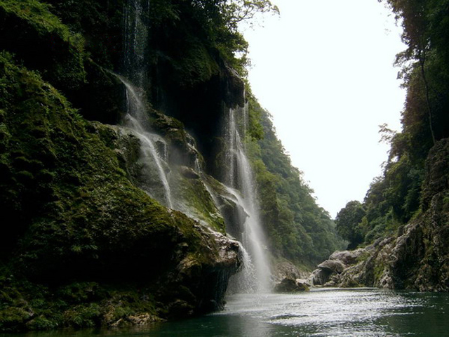猛洞河水量丰富,河流坡降大,水急滩多浪奇,高大的峭壁直插水面,两岸并相靠拢,形成幽深的峡谷景观。沿河两岸古木苍天,苍翠欲滴,奇石错落,流泉飞瀑随处可见,下游一路水碧山青,风光秀丽,野猴成群,溶洞奇特。猛洞河天下第一漂项目位于猛洞河支流,全长47公里,最精彩处位于哈妮宫至牛路河段,长约17公里。