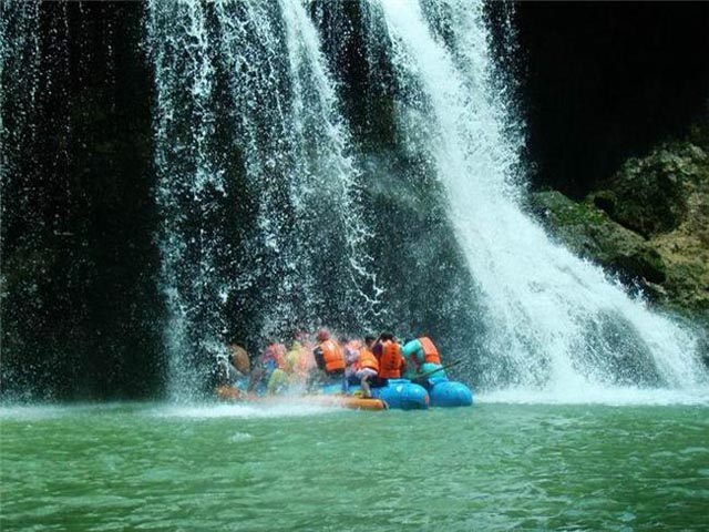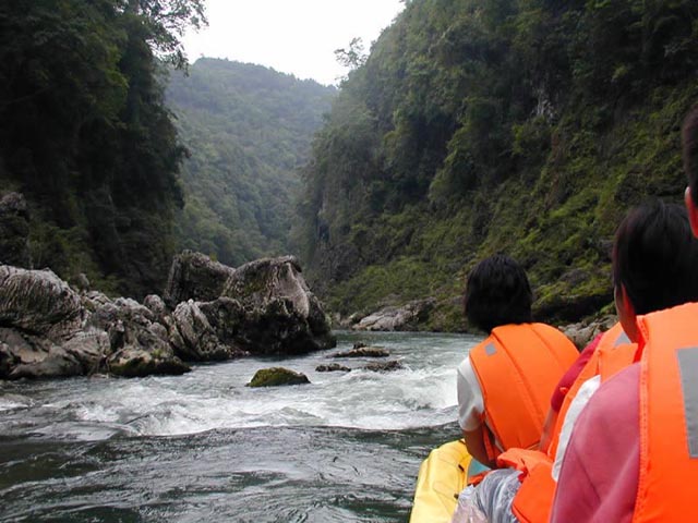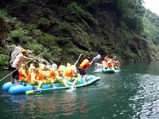天下第一漂,起点哈妮宫距王村约40公里,行车1小时,终点牛路河距王村30分钟的车程,漂流水路长17公里,漂流两个半小时。从哈妮宫放舟而下,一路是古老的河道,绝壁百里,怪石嶙峋,滩奇水异,两岸苍翠的林木,云雾缭绕,飞瀑流泉与溶岩峰林交相辉映。拐一百五十五个弯,在一百三十三个滩潭中穿梭而行,迂回流连,驰魂奔魄,心旷神怡。